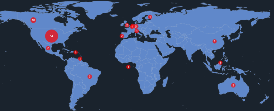 Gambar di bawah mengilustrasikan distribusi geografis infeksi ransomware Royal di seluruh dunia.
