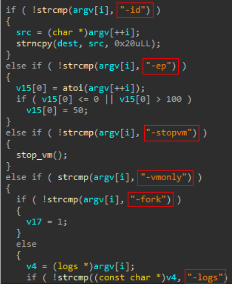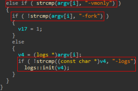 Malware memeriksa keberadaan argumen -vmonly. Jika tidak ditemukan, ia akan memeriksa argumen -fork. Jika argumen -fork terdeteksi, ini menetapkan variabel V17 ke 1. Jika -fork tidak ada, kode akan memeriksa argumen ‘-logs’. Jika argumen ini terdeteksi, fungsi logs::init() dipanggil, yang mencatat aktivitas ransomware.