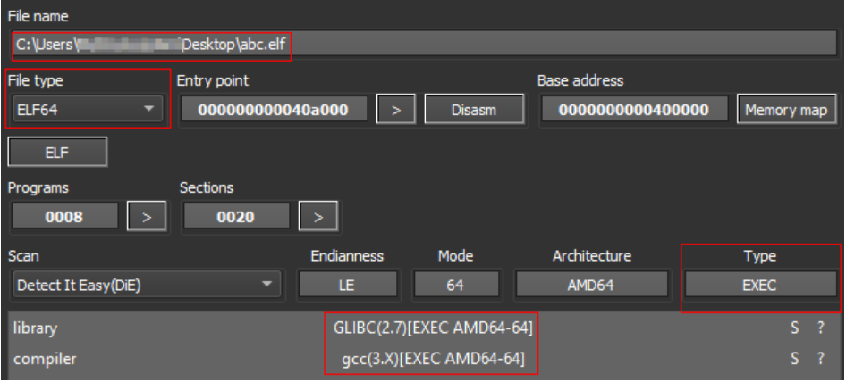 Analisis statis sampel dengan hash: b64acb7dcc968b9a3a4909e3fddc2e116408c50079bba7678e85fee82995b0f4 menunjukkan bahwa file berbahaya adalah biner ELF 64-bit yang dikompilasi menggunakan GCC, seperti yang ditunjukkan pada gambar berikut.