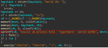 Setelah itu, ransomware membaca file ‘daftar’ dan mendapatkan World-ID dari mesin virtual yang sedang berjalan. Kemudian, ia mengakhiri mesin virtual ini dengan mengeksekusi perintah esxcli vm process kill –type=hard –world-id=%s.