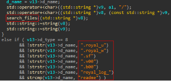 Setelah membuat proses anak, ransomware menggunakan multi-threading untuk enkripsinya menggunakan pustaka threadpool. Ini kemudian memanggil fungsi search_files() untuk mencari dan menghitung file di mesin virtual dan mengenkripsinya. Itu juga mengecualikan file dan ekstensi file tertentu dari proses enkripsi, seperti yang ditunjukkan di bawah ini.