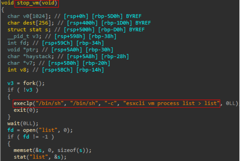 Argumen stopvm digunakan untuk menghentikan mesin virtual yang sedang berjalan di server ESXi sebelum proses enkripsi dimulai. Jika argumen ini diberikan, ransomware memanggil fungsi stop_vm() untuk menghentikan mesin virtual menggunakan metode berikut.