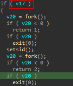 Ransomware sekarang memeriksa nilai variabel V17. Jika diatur ke 1, fungsi fork() akan dipanggil untuk menghasilkan proses anak untuk enkripsi.